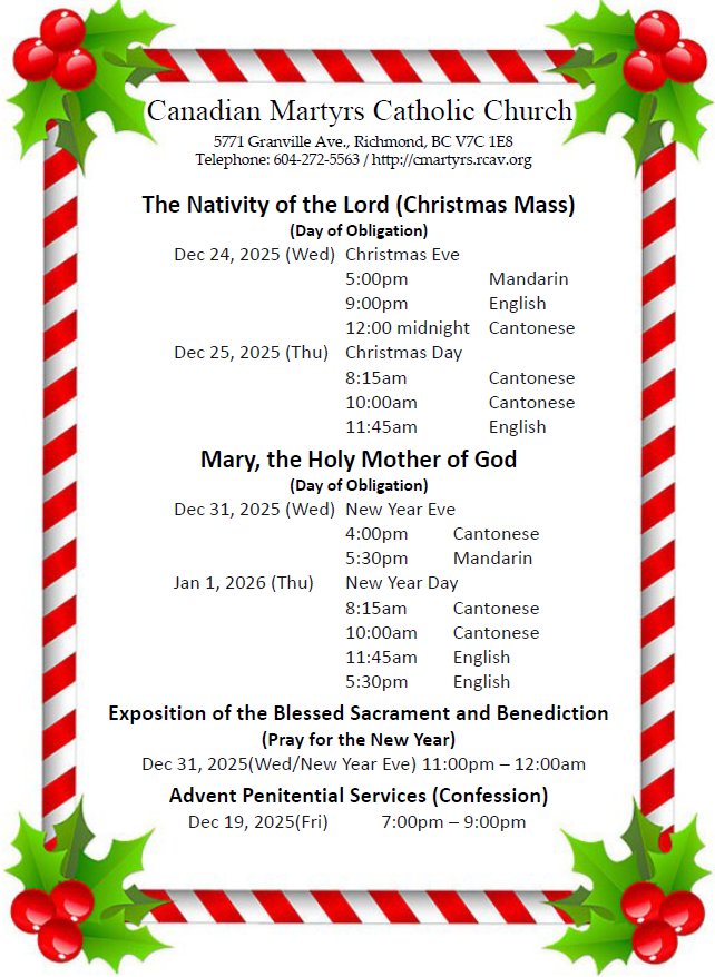 The Cantonese meeting is held every Sunday at 7:00 pm and the English meeting is held every Monday at 7:00 pm in the church. If you want to join the zoom meeting, please email Fr. Ho at fatheranthonyho@gmail.com