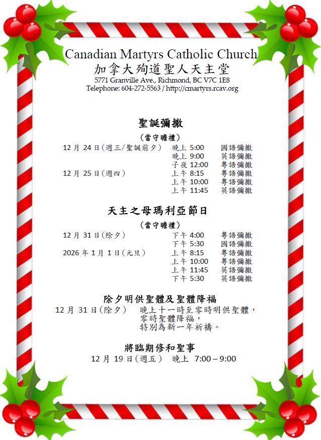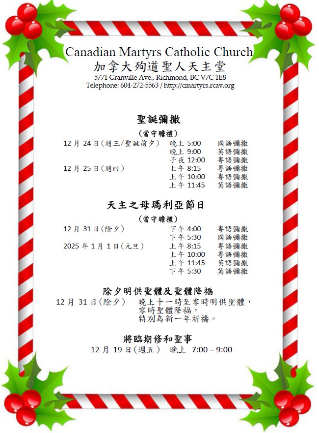 逢主日晚上7:00粵語聚會及逢週一晚上7:00英語聚會在聖堂舉行。如想網上參與祈禱會,請電郵至fatheranthonyho@gmail.com 與何神父聯絡。